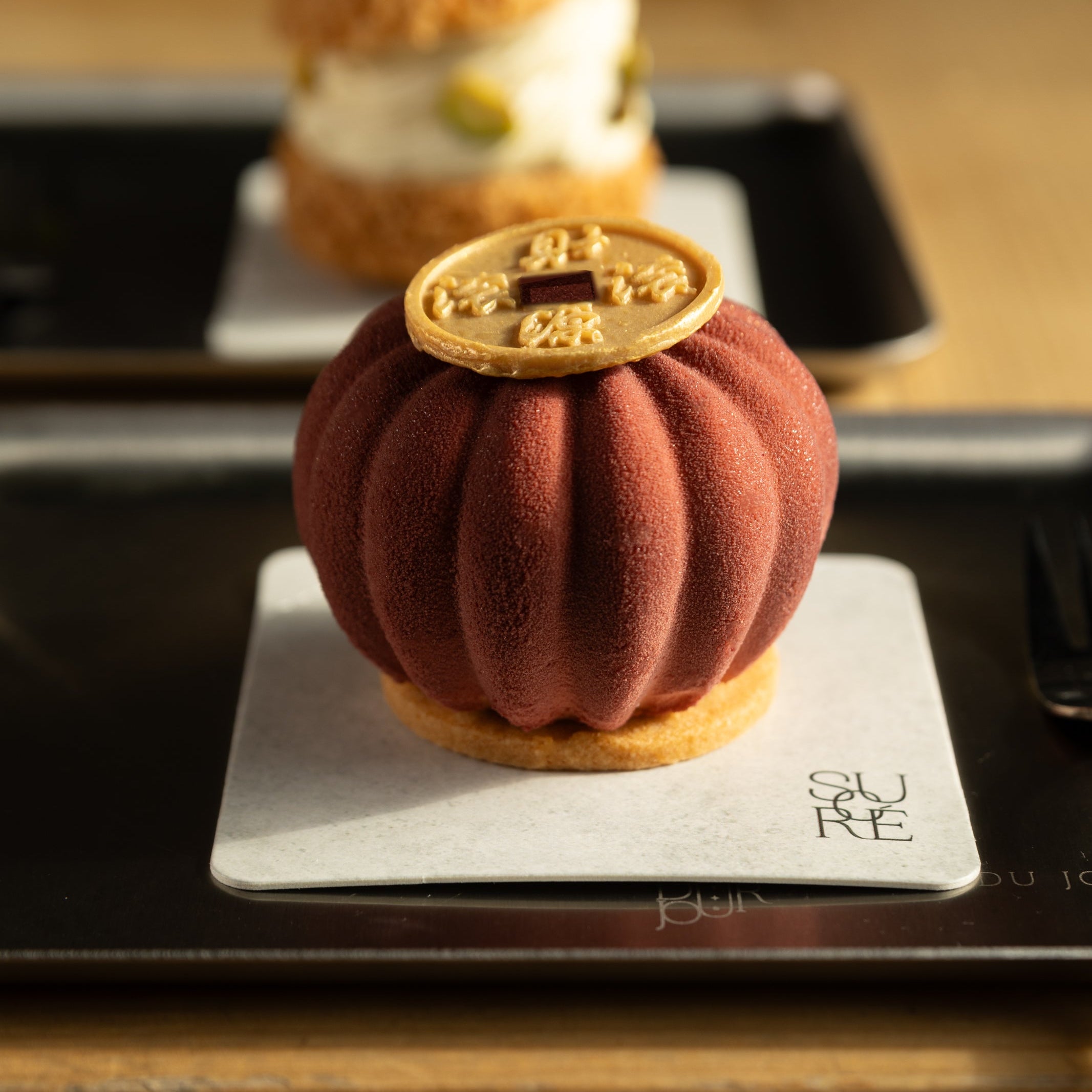 Lychee and White Peach Compote | Passion Fruit and Oolong Mousse | Almond Sponge